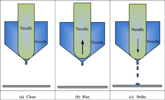 Fig. 1 The Principle of Jet-Dispensing depicted in three steps [Lu et al., 2015, Smart Materials and Structures, 24, 10]